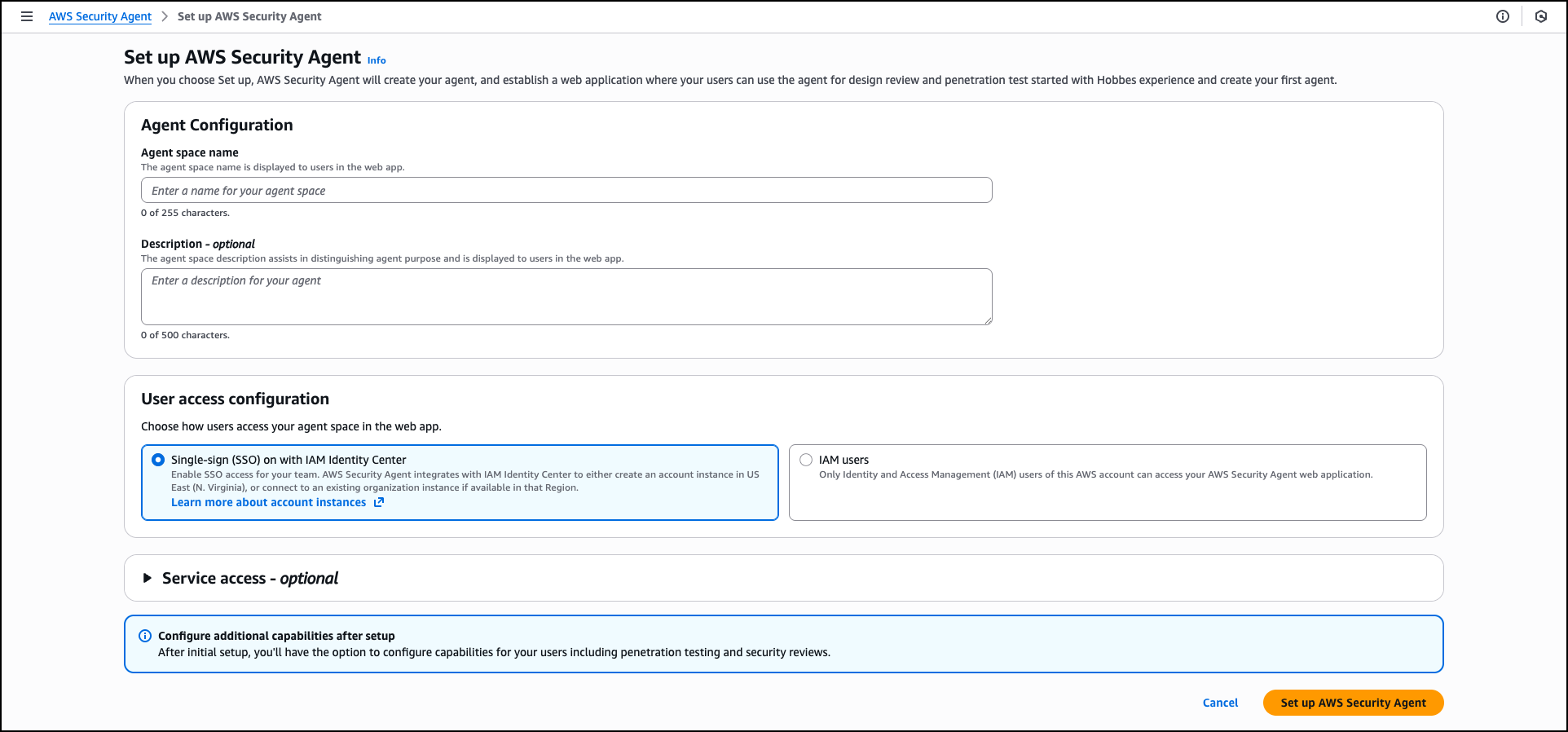 AWS Security Agent Web Application에 접근할 방법을 설정합니다. 콘솔에서 다음 두 가지 방식 중 하나를 선택합니다: