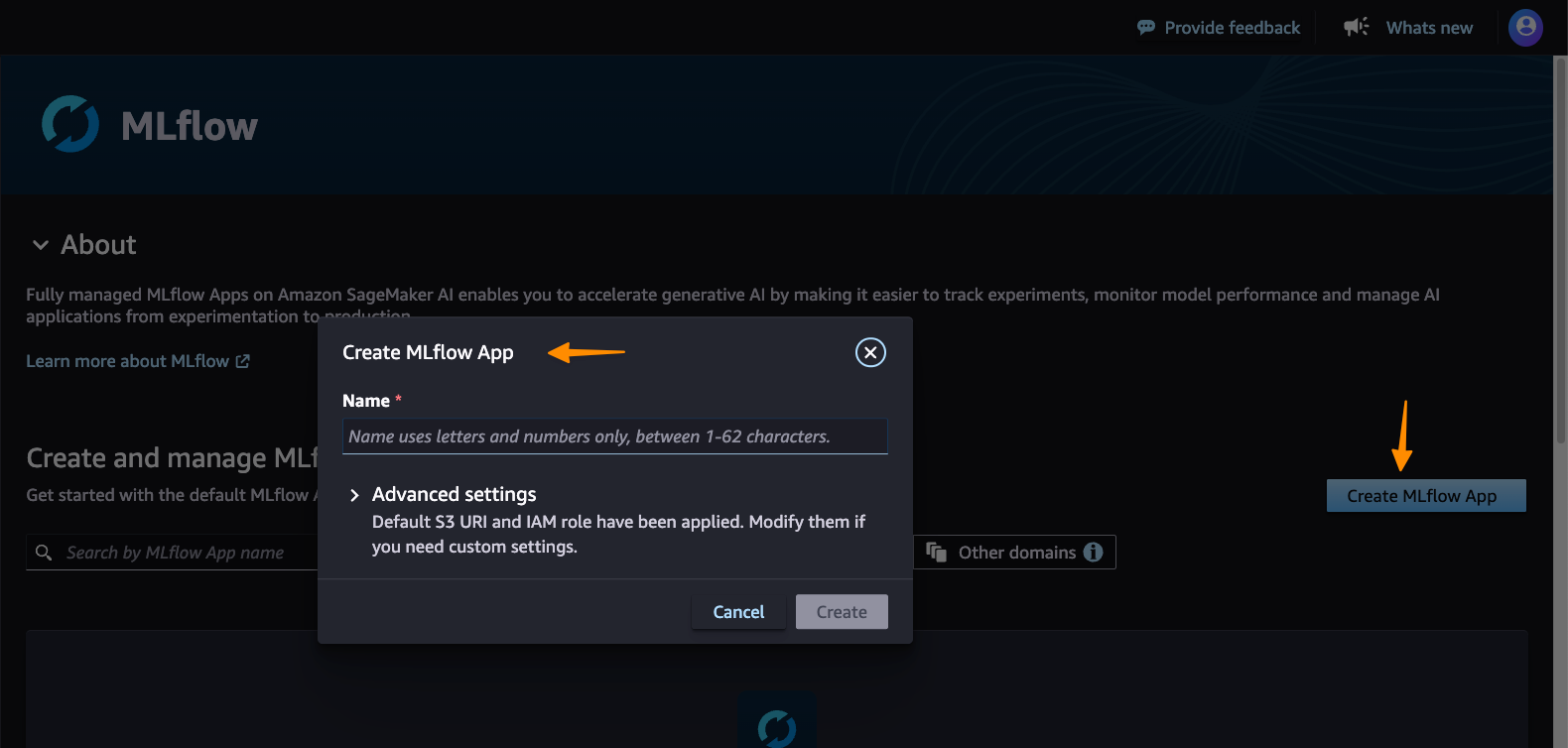 생성된 MLflow App ARN을 활용해 연결합니다: